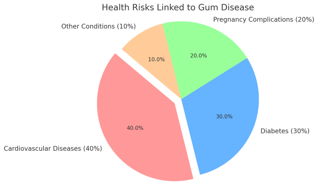 (chart showing percentages of health risks related to gum disease, such as 40% linked to cardiovascular diseases, 30% to diabetes, etc.)